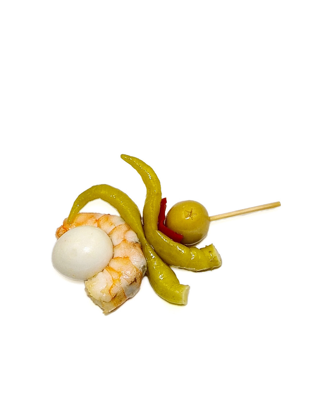 Ingredientes: LANGOSTINO cocido pelado, piparra, aceituna deshuesada, pimiento rojo, aceite de girasol y huevo de codorniz.